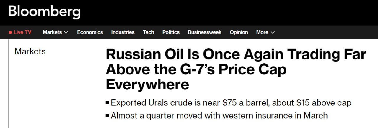 Россия продает свой сорт нефти Urals по 75 долларов за баррель, что на четверть дороже установленного членами G7 потолка цен. Нефть отгружается из портов Балтийского и Черного морей.