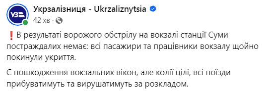 "В результате вражеского обстрела на вокзале станции Сумы пострадавших нет: все пассажиры и работники вокзала только что покинули укрытие. Есть повреждения вокзальных окон, но колеи целые, все поезда будут прибывать и отправляться по расписанию", сказано в сообщении компании.