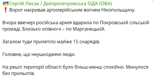 "Вчера вечером российская армия ударила по Покровской сельской громаде. Около полуночи – по Марганецкой.