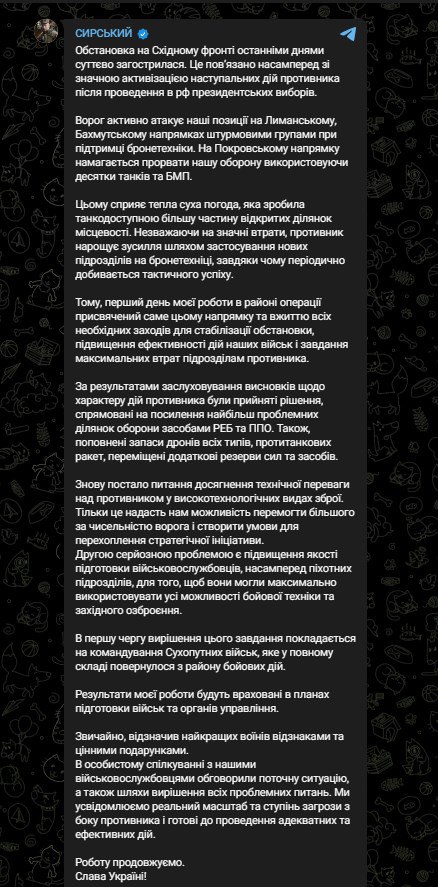 "Враг активно атакует наши позиции на Лиманском, Бахмутском направлениях штурмовыми группами при поддержке бронетехники. На Покровском направлении пытается прорвать нашу оборону, используя десятки танков и БМП.