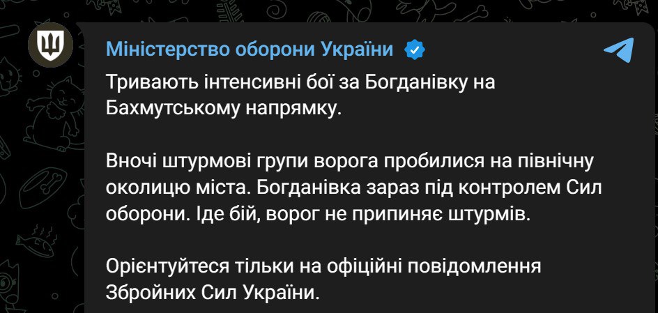 "Ночью штурмовые группы врага пробились на северную окраину города. Богдановка сейчас находится под контролем Сил обороны. Идет сражение, враг не прекращает штурмов", - заявили в МО.