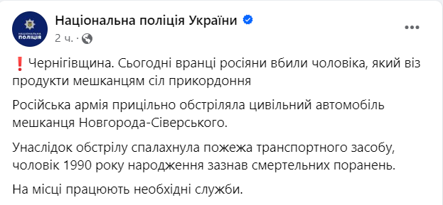 "Российская армия прицельно обстреляла гражданский автомобиль жителя Новгорода-Северского", - говорится в сообщении.