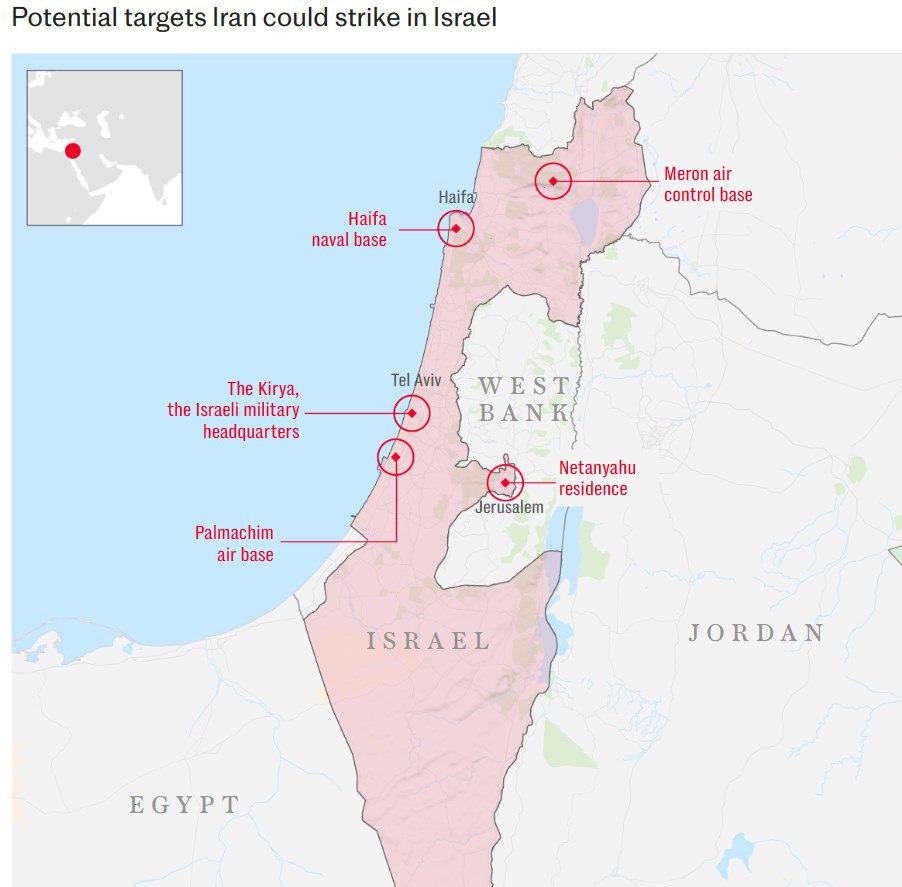 Также издание нанесло на карты потенциальные цели иракского удара. К ним относятся военные базы, аэродромы, морская база в Хайфе и резиденция премьер-министра Биньямина Нетаньяху под Иерусалимом.