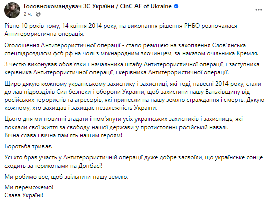 Главнокомандующий Вооруженных сил Украины Александр Сырский в 10-ю годовщину Антитеррористической операции на востоке выразил благодарность военным, которые весной 2014 года стали на защиту Украины.