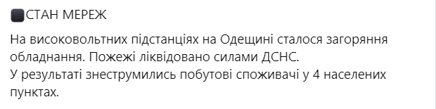 Минэнерго в своей сводке сообщает, что на нескольких высоковольтных подстанциях в Одесской области произошло возгорание оборудования. В результате были обесточены дома в четырех населенных пунктах. Пожар ликвидирован силами ГСЧС.
