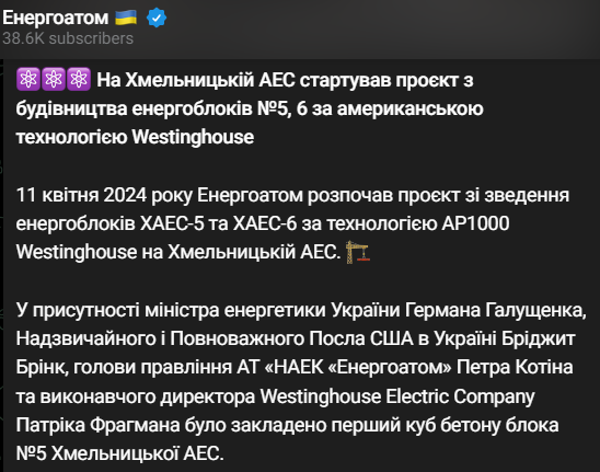 Напомним, министр энергетики Украины Герман Галущенко сообщал, что Украина планирует начать строительство четырех новых ядерных реакторов летом или осенью этого года, поскольку страна стремится компенсировать потери энергетических мощностей из-за войны с Россией. Все четыре реактора будут построены на Хмельницкой АЭС.