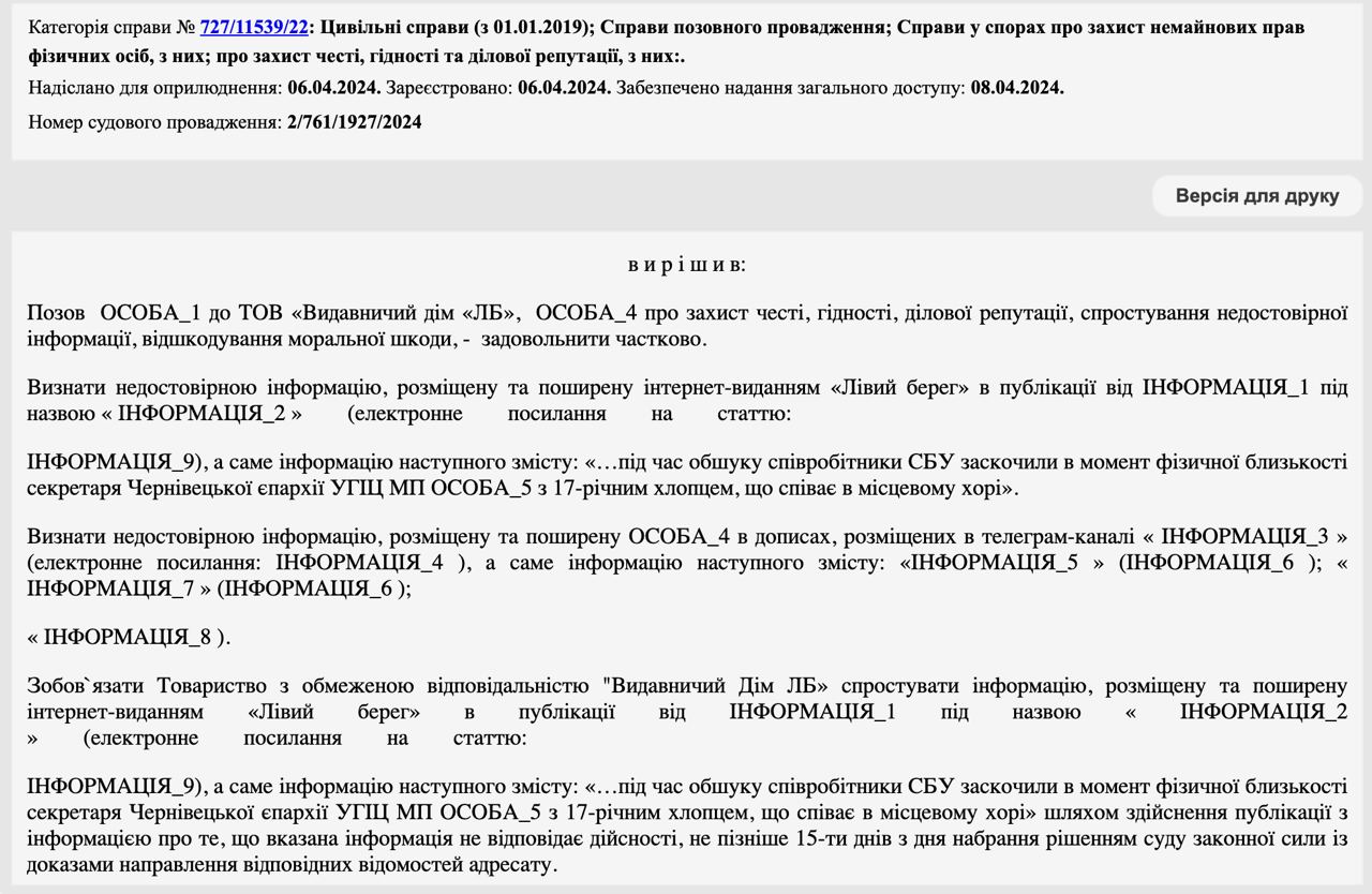 Издание "Левый берег", которое сообщило об этом со ссылкой на "источники", обязали компенсировать моральный ущерб - 10 тысяч гривен и 2 тысячи гривен судебного сбора.