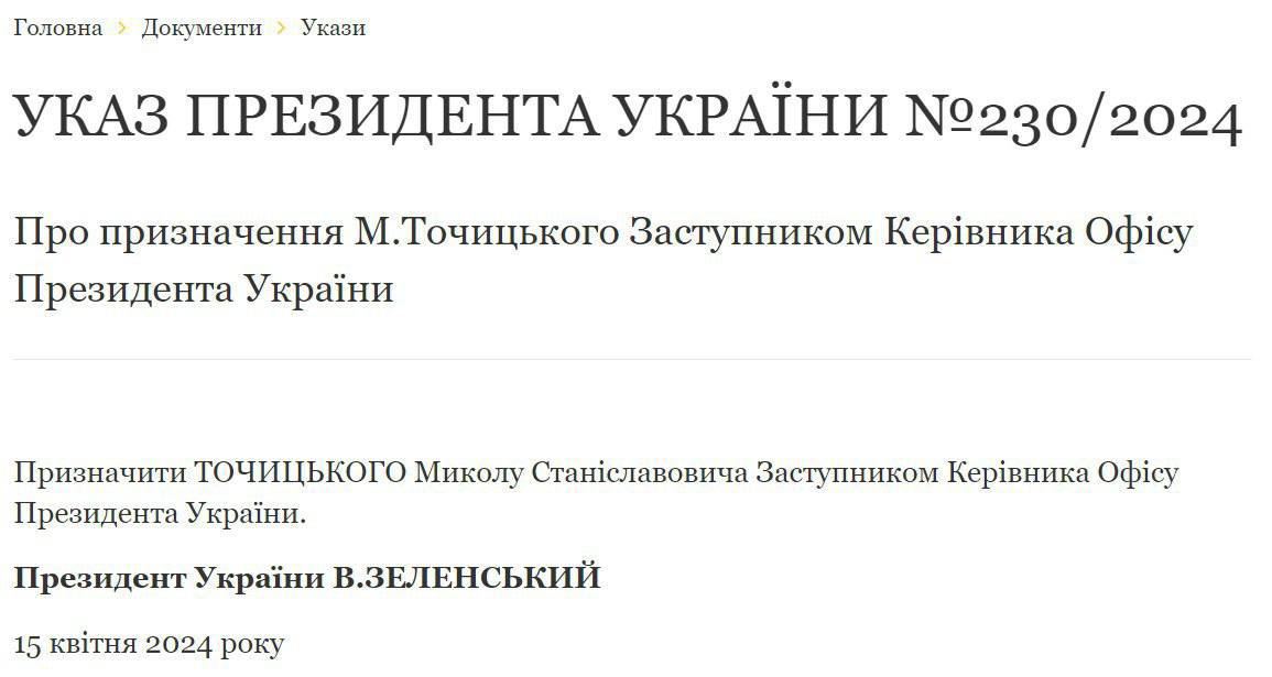 "Назначить Точицкого Николая Станиславовича заместителем руководителя Офиса президента Украины", - говорится в документе.