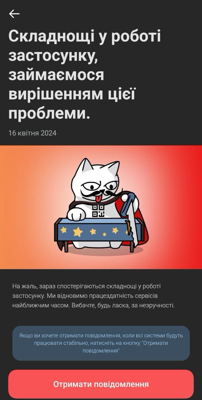 "Извините, пожалуйста, сейчас есть сложности на нашей стороне, которые могут отразиться на вашей работе с приложением или с проведением платежей. Данный вопрос уже передан на максимально высокий уровень, и наши специалисты работают, чтобы как можно скорее исправить. Пожалуйста, дайте нам немного времени", — сказал "Стране" менеджер monobank.