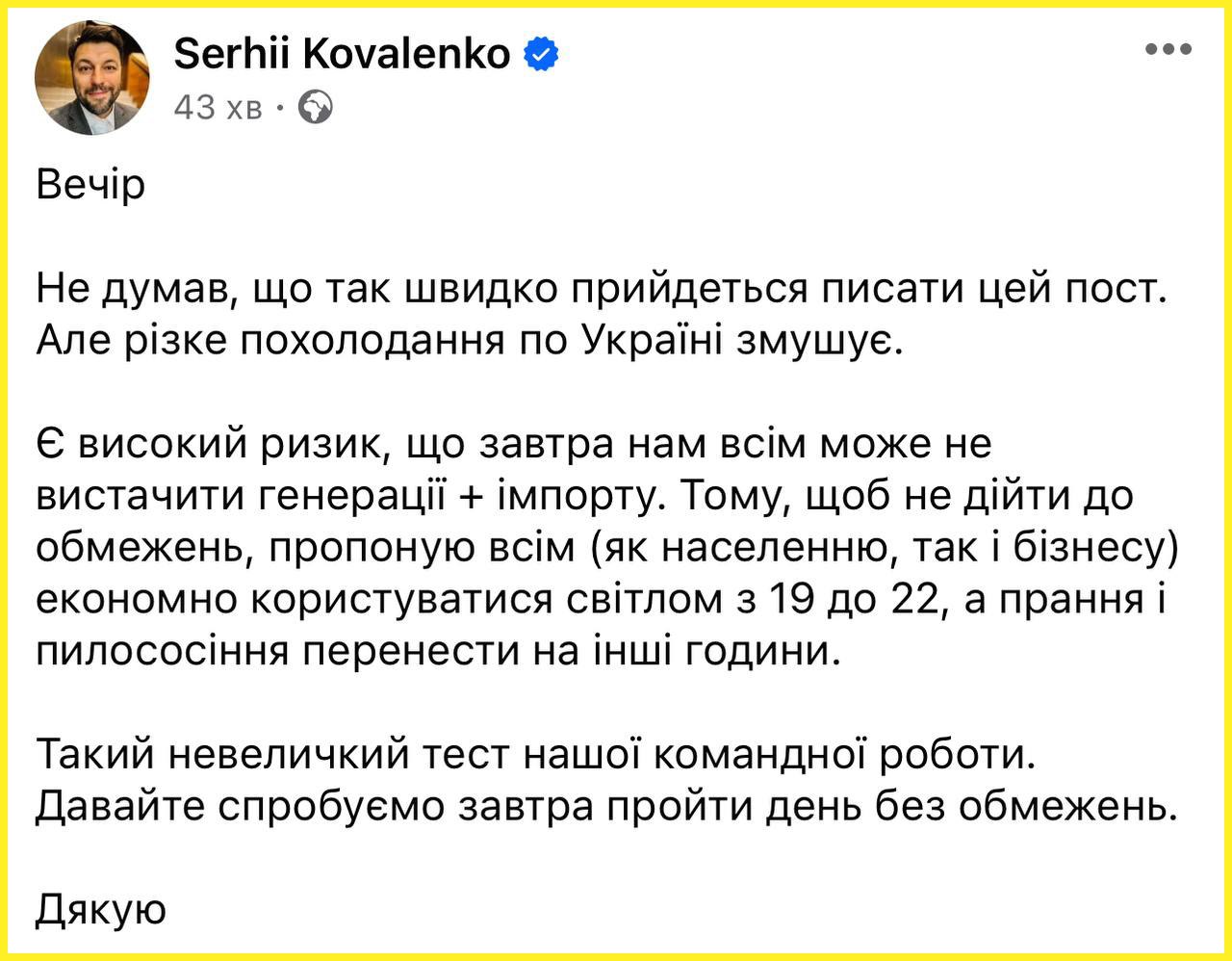 Коваленко объяснил, что проблема в резком похолодании по всей стране и призвал экономить электричество с 19:00 до 22:00.