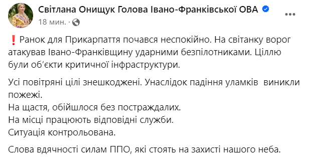 "На рассвете враг атаковал Ивано-Франковскую область ударными беспилотниками. Целью являлись объекты критической инфраструктуры. Все воздушные цели обезврежены. В результате падения обломков возникли пожары", - написала она.