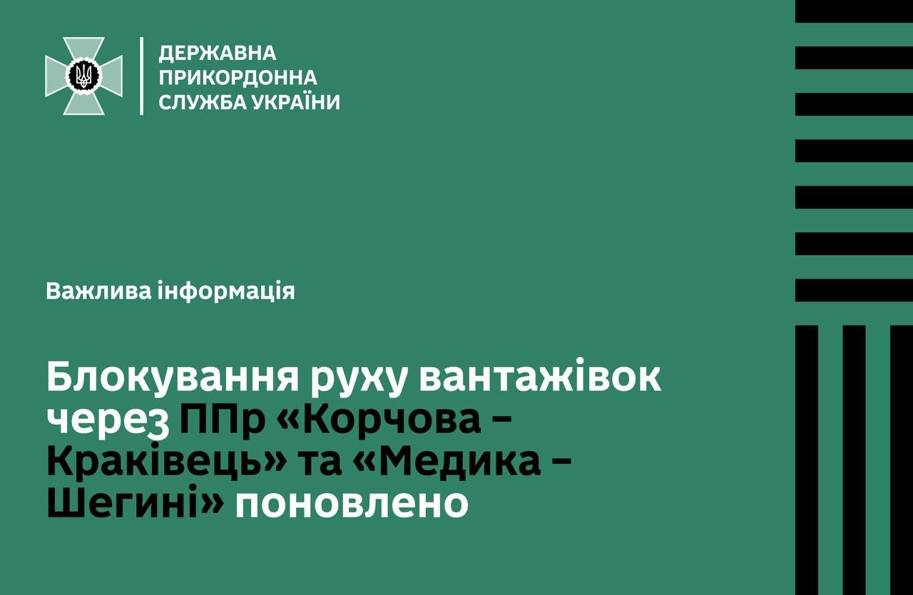 Польские фермеры сегодня с утра возобновили блокаду двух пунктов пропуска "Корчева - Краковец" и "Медика - Шегини". Блокада продлится 1-2 дня.