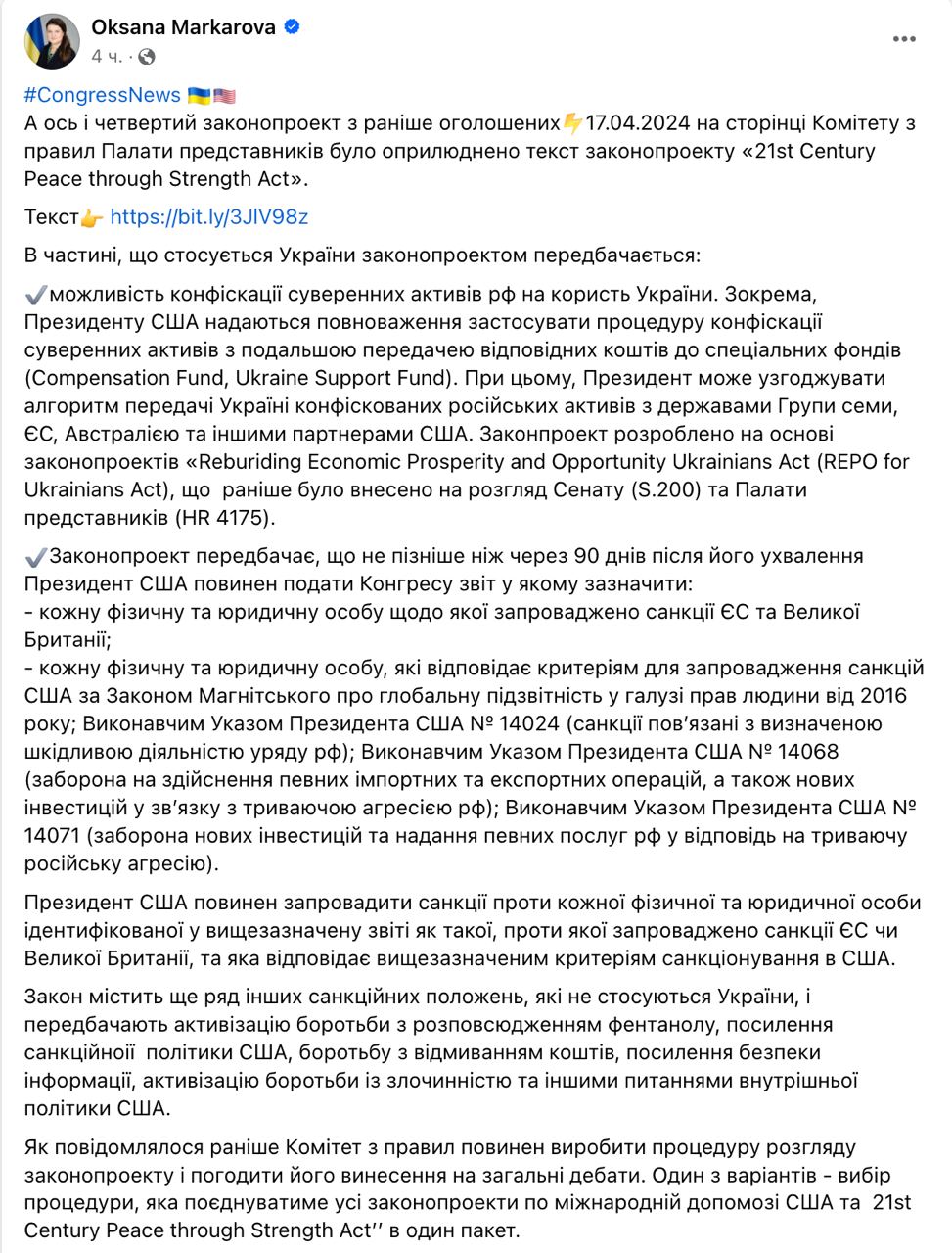 Посол Украины в США Оксана Маркарова проанализировала его текст.