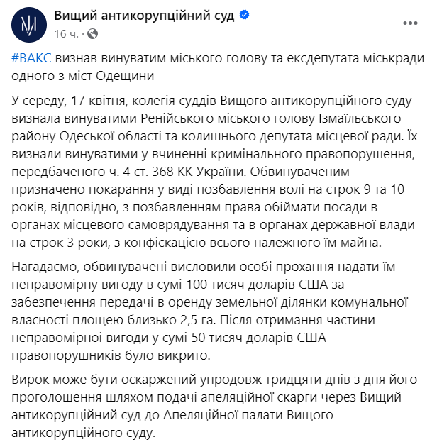 Высший антикоррупционный суд Украины приговорил мэра Рени Одесской области Игоря Плехова к 9 годам тюрьмы, а экс-депутата местного горсовета Ивана Пойдолова - к 10.