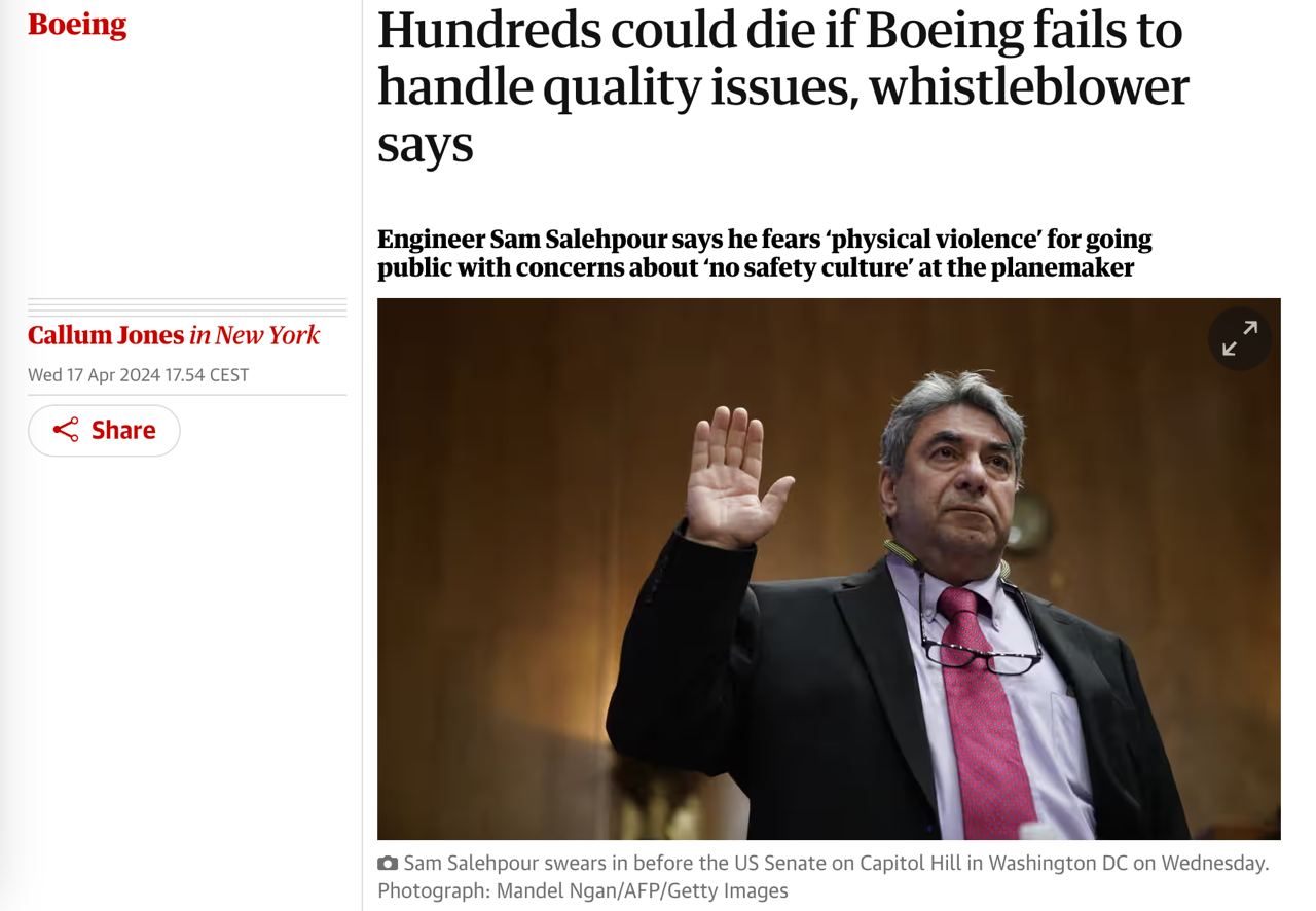 По словам Салехпура, у авиастроителя "нет культуры безопасности", а сотрудников, которые поднимают тревогу, "игнорируют, маргинализируют, подвергают угрозам, отстраняют и даже хуже".