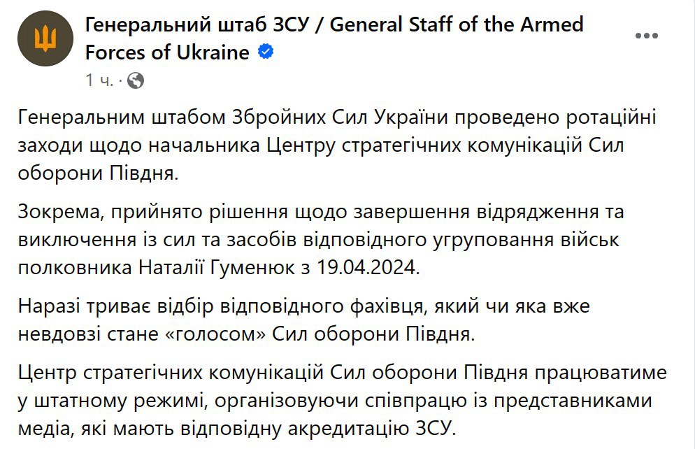 "Принято решение о завершении командировки и исключения из сил и средств соответствующей группировки войск полковника Натальи Гуменюк с 19.04.2024. В настоящее время идет отбор соответствующего специалиста, который или которая вскоре станет "голосом" Сил обороны Юга", - говорится в заявлении Генштаба.