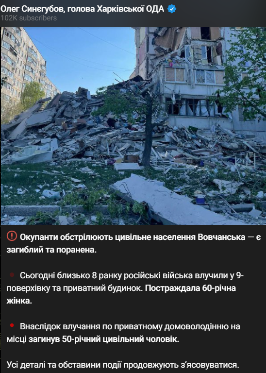 12:20 Сегодня утром российские военные обстреляли Волчанск Харьковской области. В результате есть попадание в 9-этажку и частный дом, пострадала 60-летняя женщина, а в частном доме погиб 50-летний мужчина.