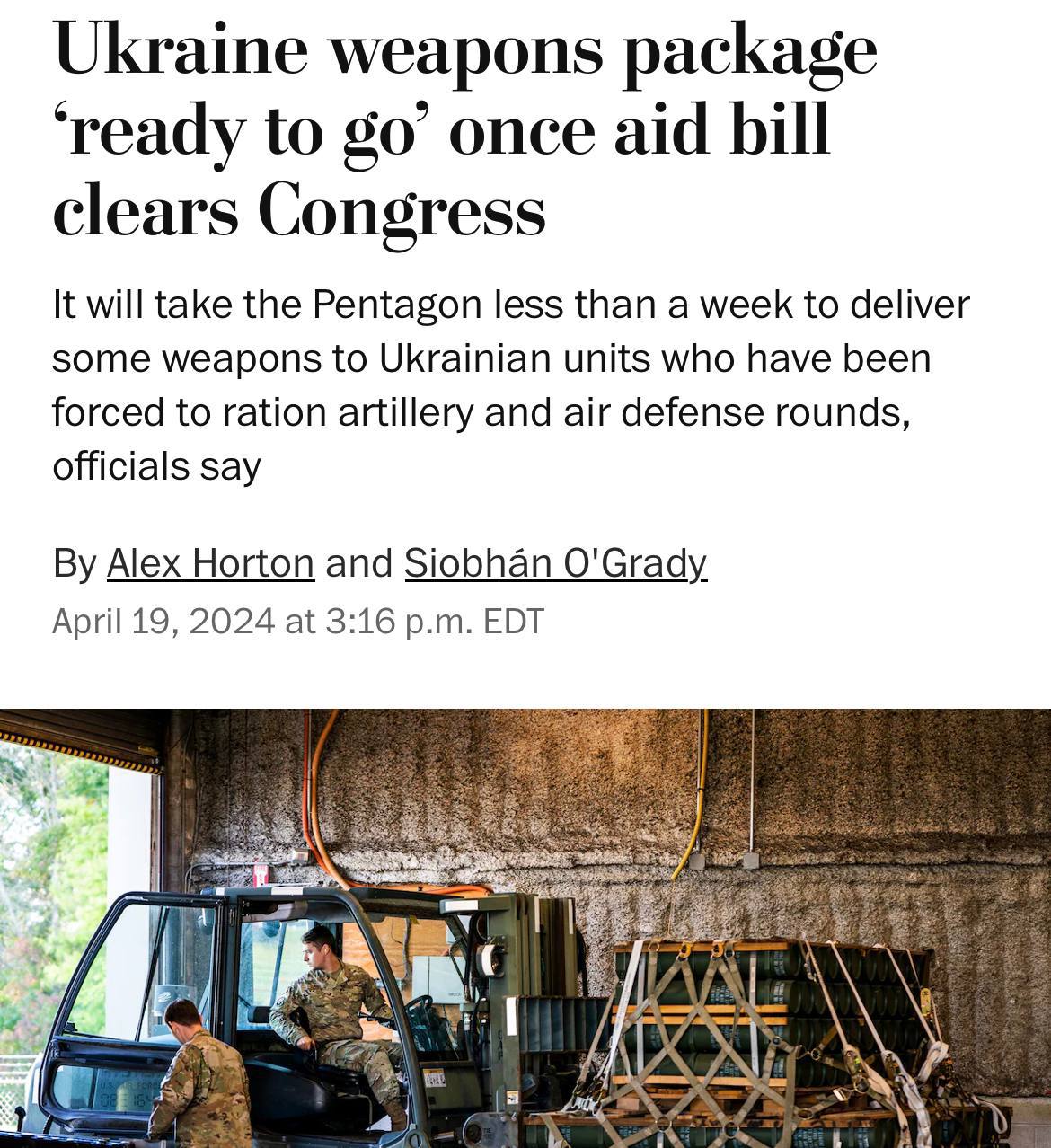 Чиновник на условиях анонимности, заявил, что после того, как законопроект об иностранной помощи на сумму 95 миллиардов долларов будет подписан, "потребуется менее недели, чтобы часть оружия достигла поля боя". Законопроект включает около 60 миллиардов долларов для Украины, остальная часть предназначена для Израиля и партнеров США в Азии.
