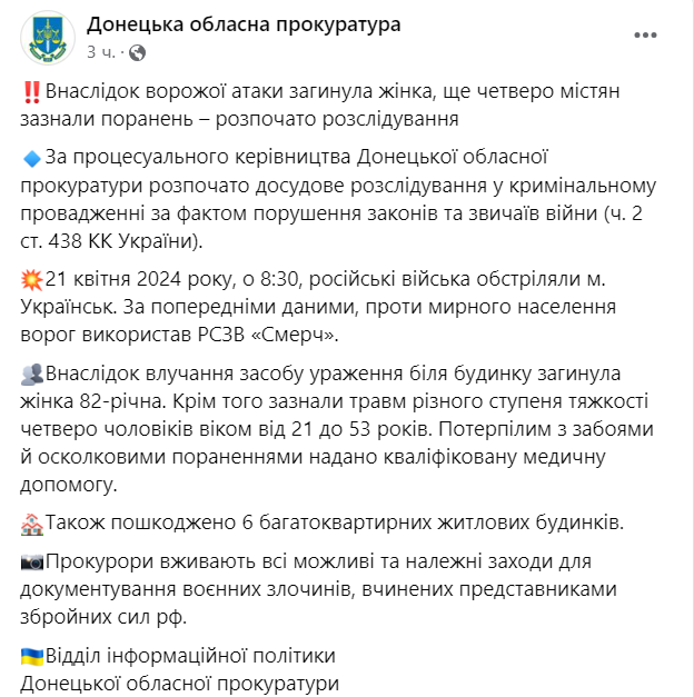 Донецкая прокуратура сообщила, что российские военные обстреляли Украинск предварительно с помощью РСЗО "Смерч".