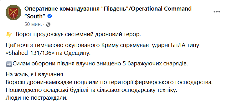 В Силах обороны юга добавили, что дроны запускались с территории временно захваченного РФ Крыма. Удалось сбить пять беспилотников.