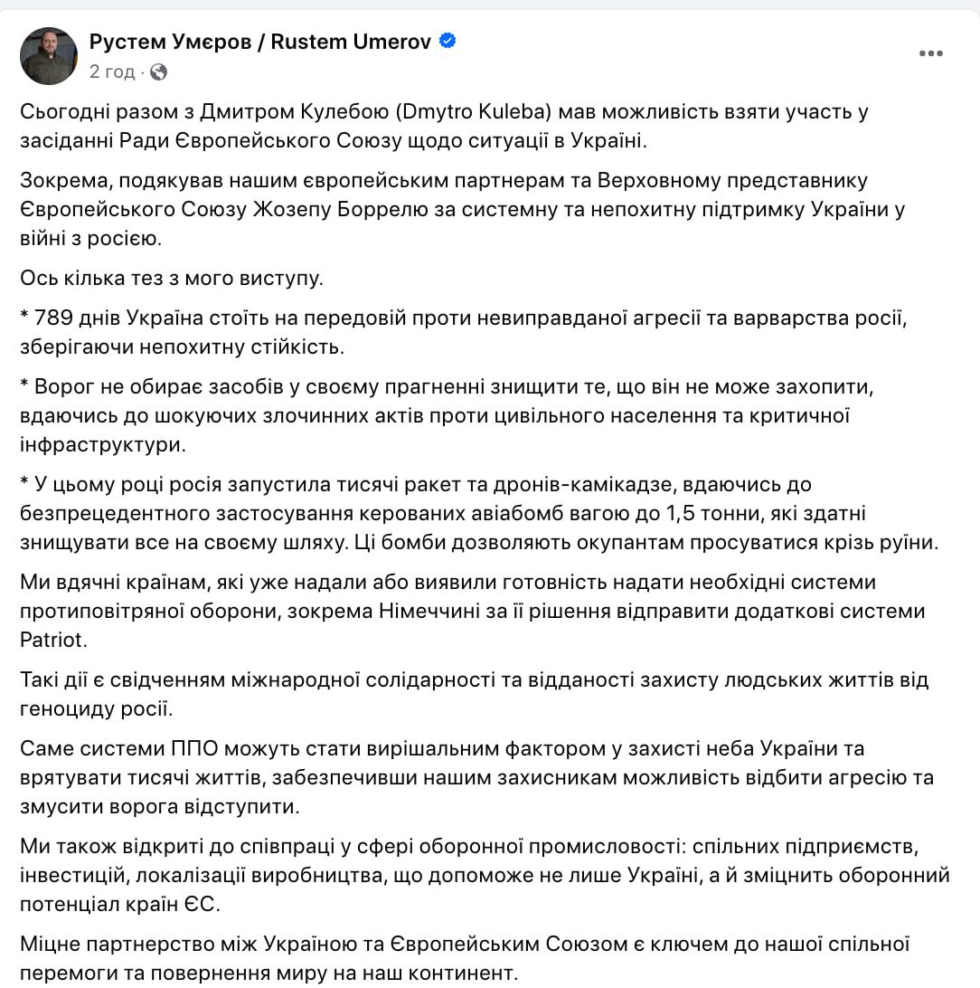 Об этом написал в Фейсбуке министр обороны Рустем Умеров.