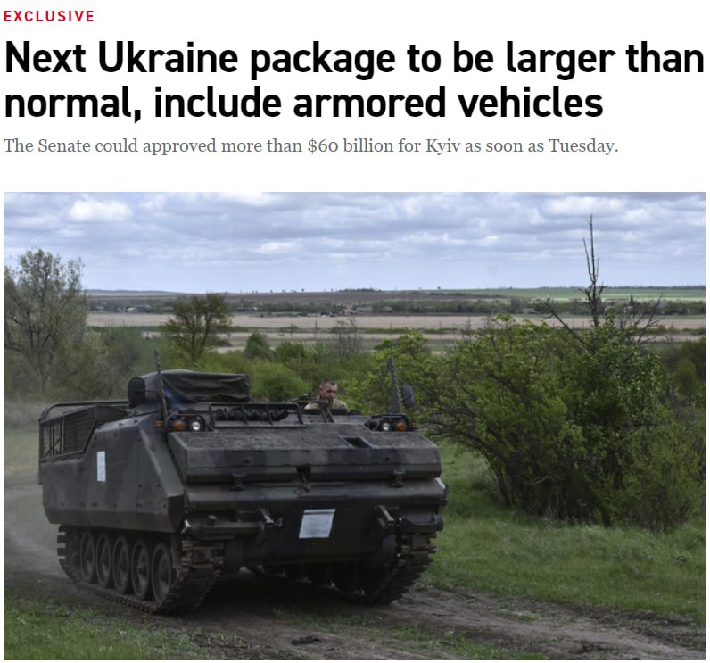 В публикации говорится, что следующий пакет военной помощи США для Украины будет значительно больше обычного и его направят сразу после того, как Сенат окончательно утвердит закон о содействии Киеву, недавно принятый Палатой представителей.