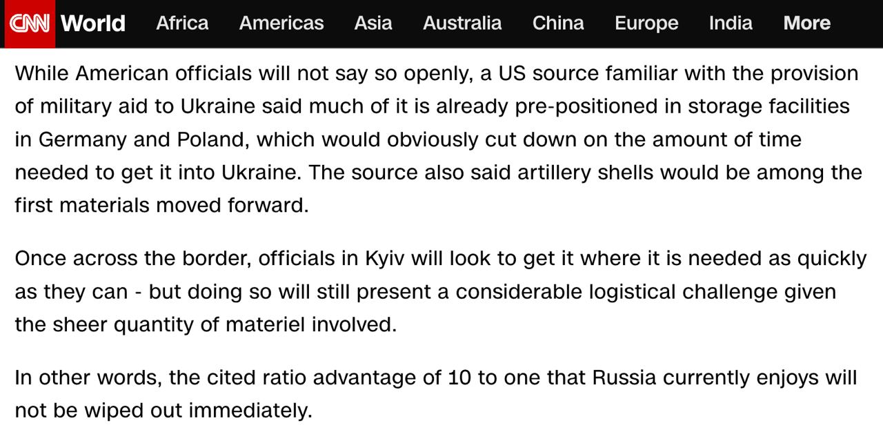 "Другими словами, упомянутое преимущество в соотношении 10 к одному, которым сейчас пользуется Россия, не будет уничтожено немедленно", - считает CNN.
