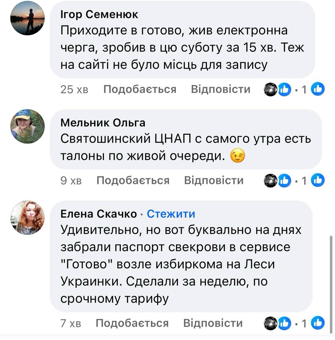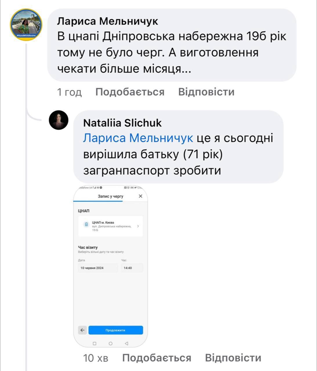 "Тоже заканчивался срок паспорта у сына. Я не смогла записаться - не было свободных слотов. Поехала в ближайший паспортный стол, непосредственно там через терминал взяла талончик в живую очередь, где-то +/- в течении полутора часов подала документы. Через 10 рабочих дней получила его новый паспорт. Подавала на обычное изготовление, без ускорения. Днепр, Новокодацкий", — отмечает пользователь.