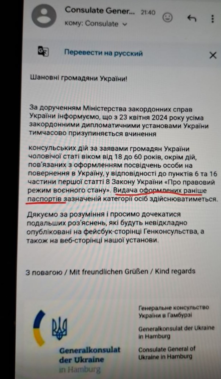 В-третьих, украинское консульство в Гамбурге. В рассылке, которая приходит беженцам в Германии, подтверждается, что новые документы от мужчин призывного возраста принимать не будут.