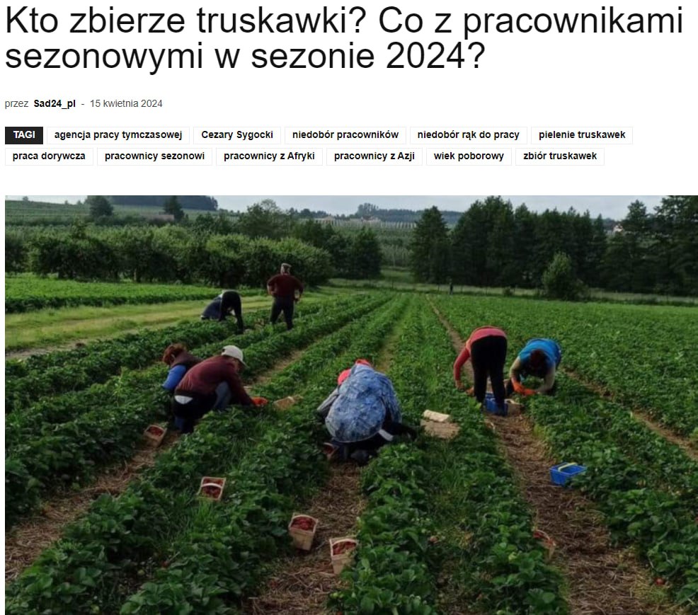 Владелец агентства по трудоустройству Czarston Цезарий Сигоцкий отметил, что количество садов и плантаций в Польше растет, а количество работников - нет.