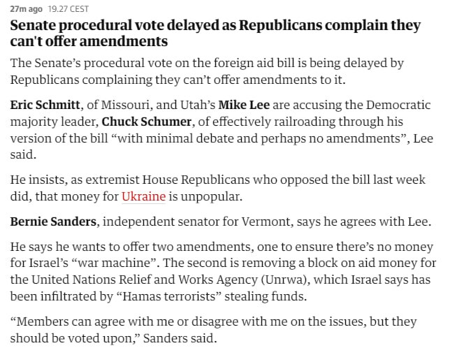 По информации издания, процедурное голосование в Сенате по законопроекту об иностранной помощи откладывают из-за жалоб республиканцев на то, что они не могут предложить к нему поправки.