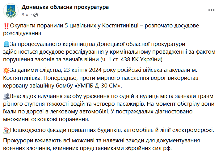 Во вторник, 23 апреля, в результате удара по Константиновке ранены пять человек.