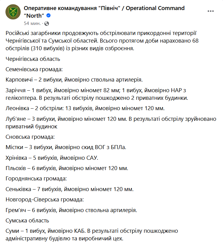 Об этом сообщает Оперативное командование "Север" на своей странице в Фейсбуке.