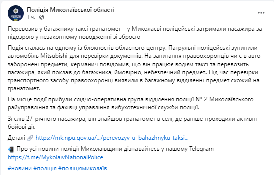 "Событие произошло на одном из блокпостов областного центра. Патрульные полицейские остановили автомобиль Mitsubishi для проверки документов. На вопрос правоохранителей есть ли в авто запрещенные предметы, водитель сообщил, что он работает водителем такси и перевозит пассажира, который положил в багажник, вероятно, опасный предмет. Во время проверки транспортного средства правоохранители обнаружили в багажном отделении предмет, похожий на гранатомет" - говорится в сообщении.
