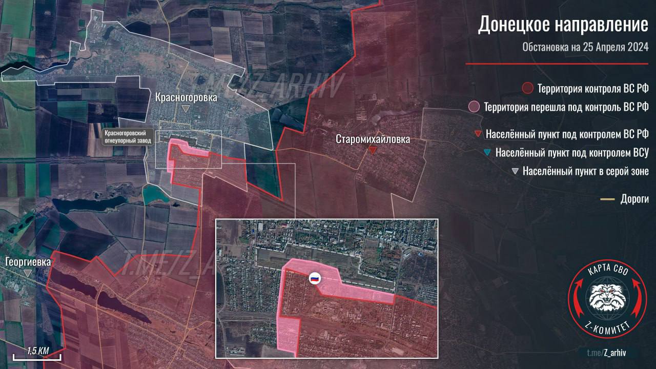 16:03 Российские военные паблики пишут о серьёзном продвижении армии РФ в Красногоровке под Донецком. Они публикуют видео с российским флагом в одном из корпусов огнеупорного завода - ключевой точки обороны ВСУ в городе. По российским картам как минимум часть этого завода уже захвачена россиянами.