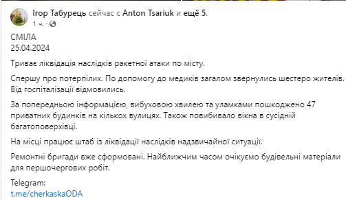 Утром мы сообщали, что в Черкасской области повреждена критическая инфраструктура после утренней атаки РФ. Силы ПВО отработали по "скоростной воздушной цели".