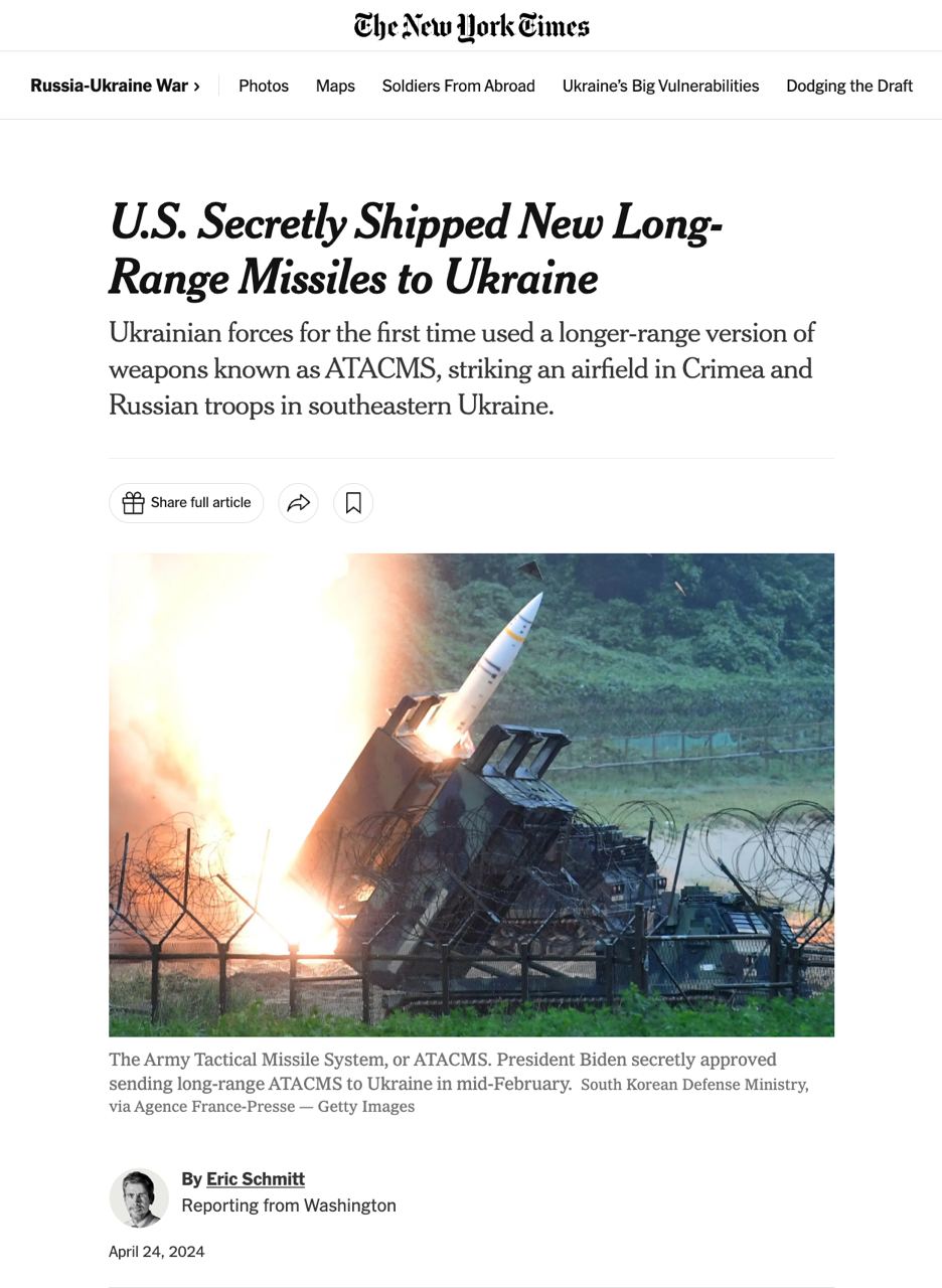 В марте Украина тайно получила более 100 дальнобойных ракет ATACMS от США и использовала их против РФ.