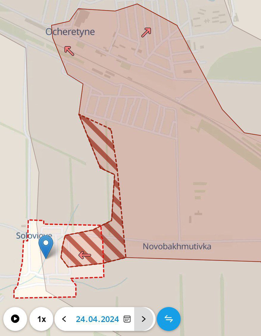 Соловьево, судя по карте ресурса, захвачено примерно на треть. Российские паблики утверждают, что Соловьево занято почти все до юго-западных окраин. Украина этого не подтверждала.