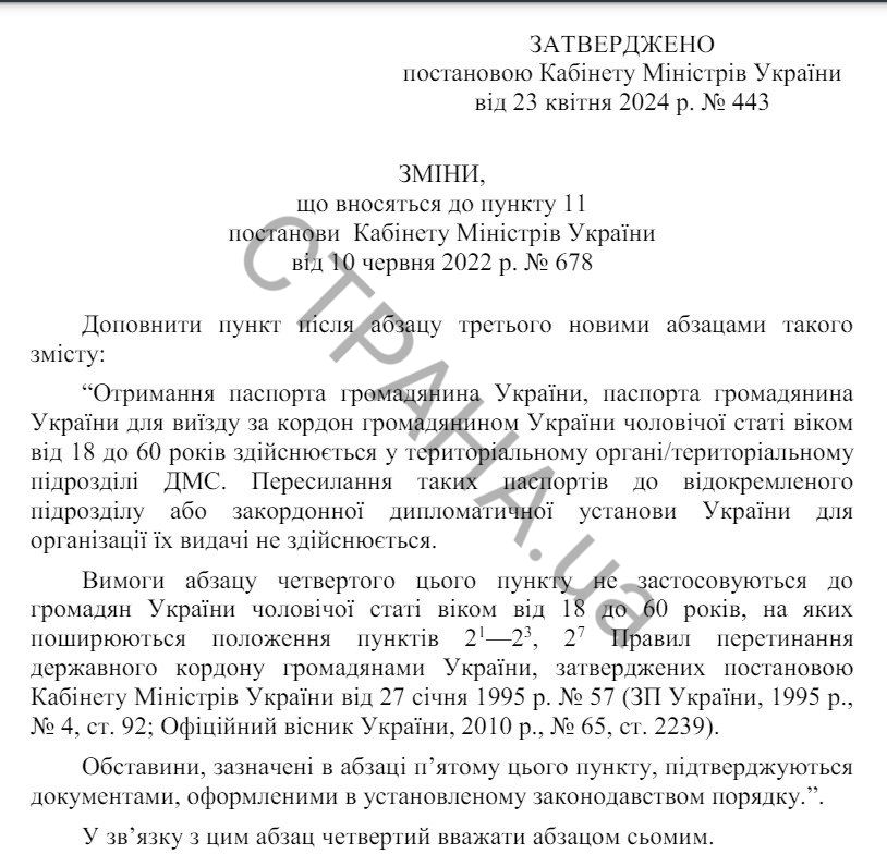 В документе говорится, что "получение паспорта гражданина Украины, паспорта гражданина Украины для выезда за границу гражданином Украины мужского пола возрастом от 18 до 60 лет осуществляется в территориальном органе подразделения Госмиграционной службы. Пересылка таких паспортов в обособленные подразделения или зарубежные дипломатические учреждения Украины для организации их выдачи не производится".
