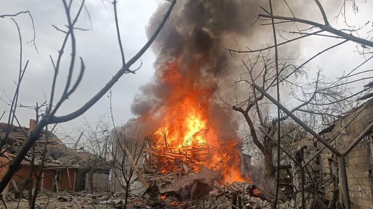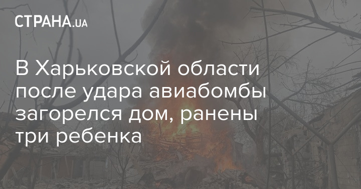 В Дергачах Харьковской области частный дом загорелся после удара авиабомбы.