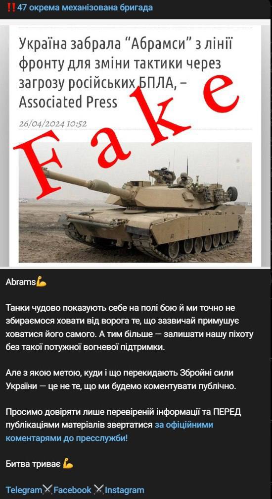47-я отдельная механизированная бригада прокомментировала информацию американских СМИ о том, что ВСУ отвели танки Abrams с передовой из-за угрозы их уничтожения российскими дронами.