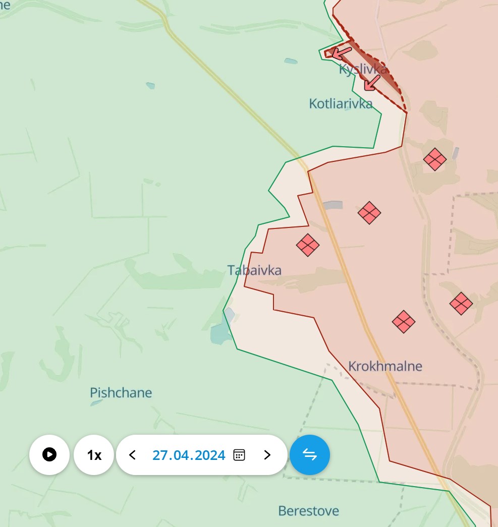 Deep State пишет, что наступление там началось утром 26 апреля и к концу дня россияне закрепились в Кисловке. Российские паблики пишут, что она полностью захвачена.
