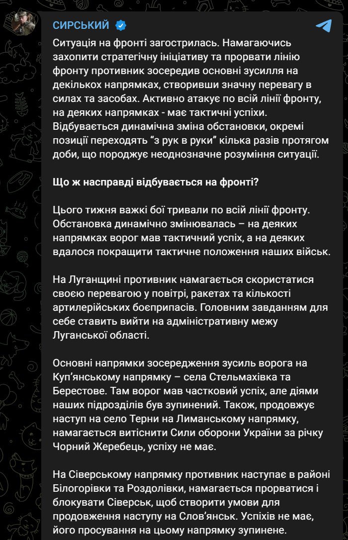 "Пытаясь захватить стратегическую инициативу и прорвать линию фронта, противник сосредоточил основные усилия на нескольких направлениях, создав значительное преимущество в силах и средствах. Активно атакует по всей линии фронта, на некоторых направлениях имеет тактические успехи", - написал главком ВСУ.