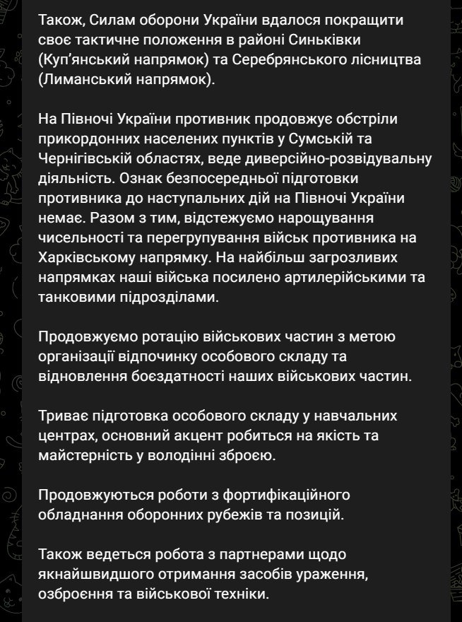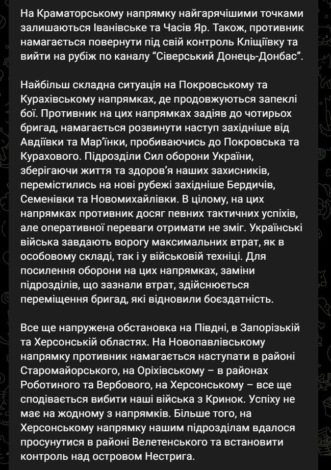 По его словам, наиболее сложная ситуация сложилась на Покровском и Кураховском направлениях, где продолжаются ожесточенные бои.