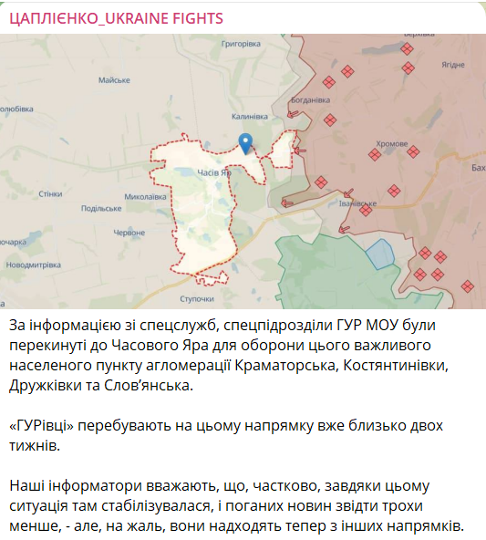 Для остановки прорыва РФ под Часов Яр был переброшен спецназ Главного управления разведки (ГУР) Министерства обороны Украины.