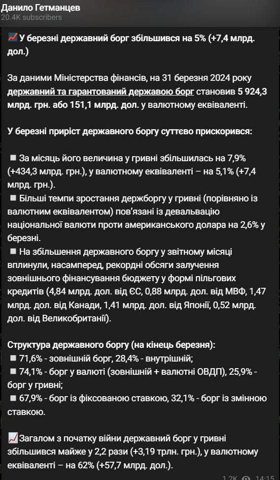 По данным Министерства финансов, на 31 марта 2024 года государственный и гарантированный государством долг составил 5 924,3 млрд. грн. или 151,1 млрд. дол. в валютном эквиваленте.