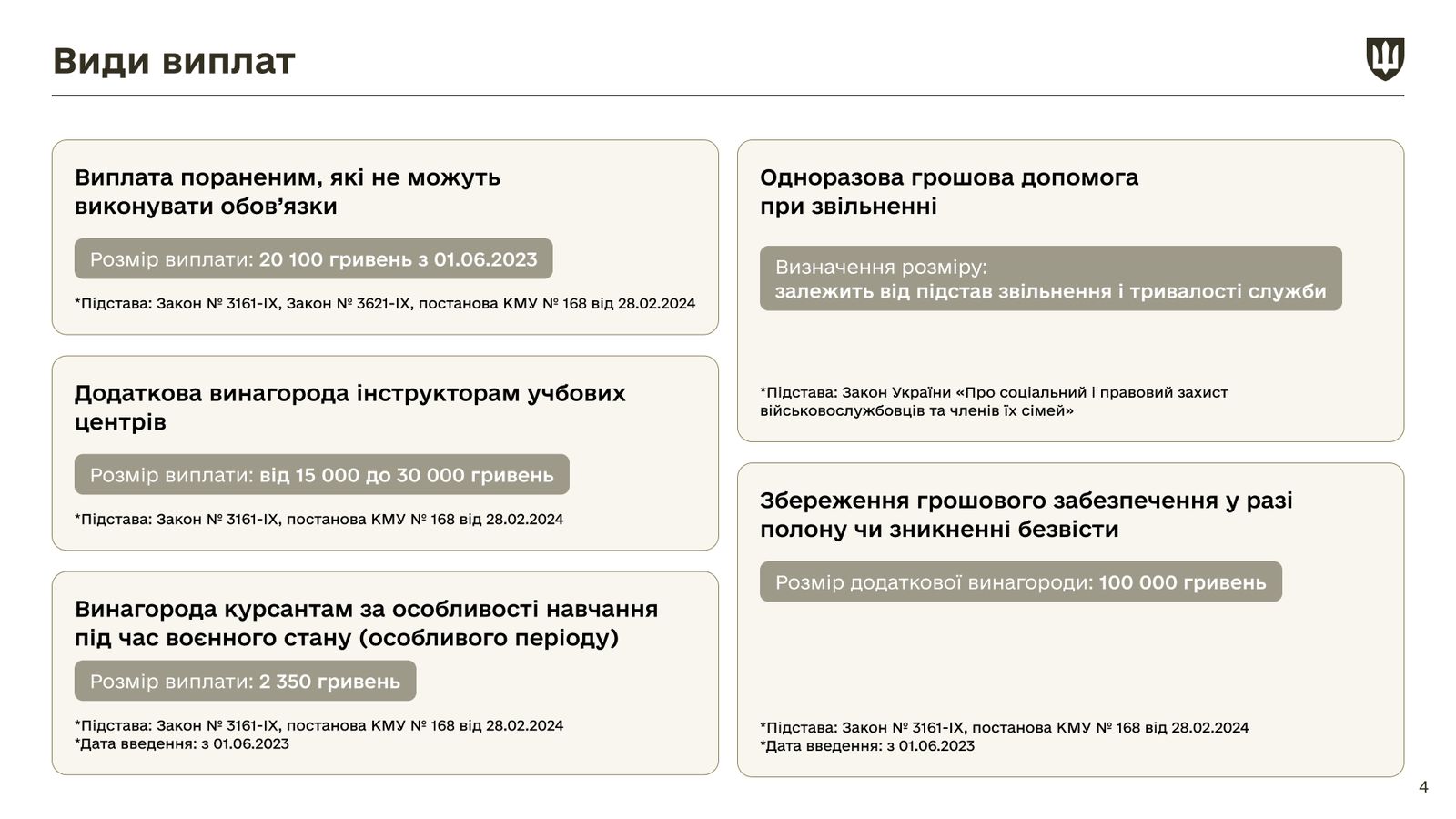 Выплата раненым, которые не могут исполнять обязанности, – 20 100 грн.