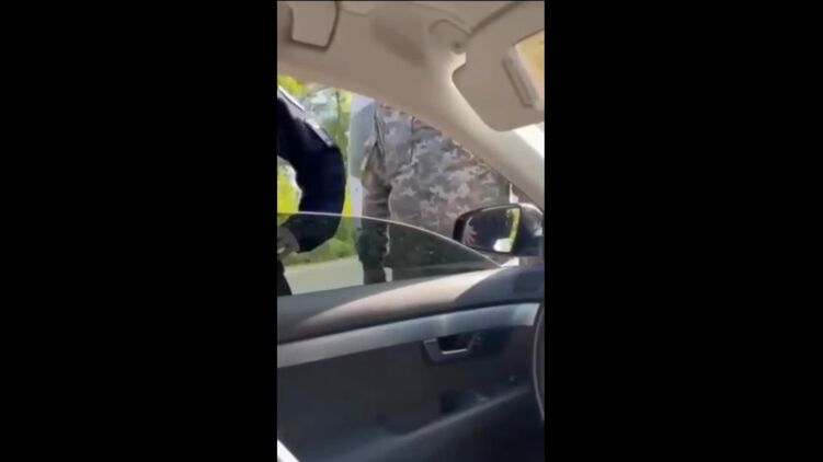 После этого полицейский отходит от машины, и к двери водителя подходит человек в военной форме, спрашивая документы.