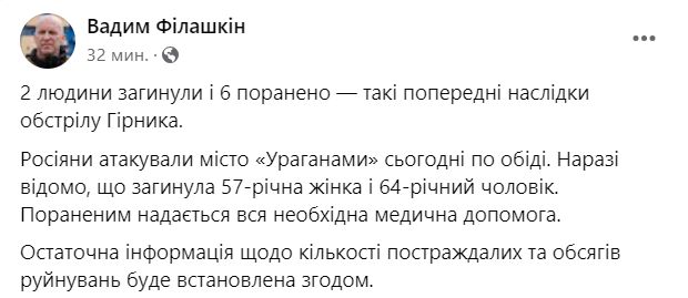 "Россияне атаковали город "Ураганами" сегодня после обеда. Пока известно, что погибла 57-летняя женщина и 64-летний мужчина. Раненым предоставляется вся необходимая медицинская помощь", - написал он.