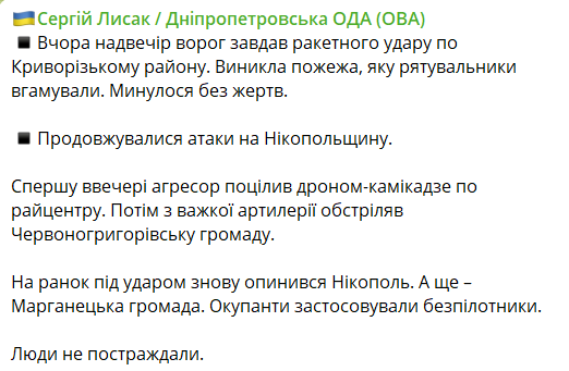 "Сначала вечером агрессор попал дроном-камикадзе по райцентру. Затем из тяжелой артиллерии обстрелял Красногригорьевскую общину. К утру под ударом снова оказался Никополь. А еще – Марганецкая община. Оккупанты применяли беспилотники. Люди не пострадали", - сообщил Лысак.